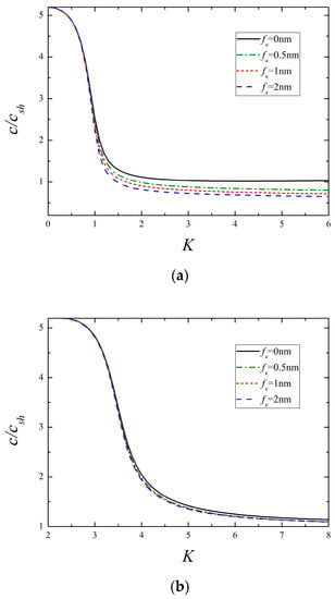 and the surface effects in Equation (41) are invalid at this point. This is because the waves mainly propagate in the semi-infinite substrate at very low frequencies, and apparently, the surface effects of piezoelectric film have no impact on the wave characteristics of the substrate. Next, taking the limit in Equation (41) under the case of results in