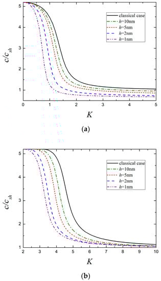 The variation of the dispersion curves of the lowest two modes with different film thickness is plotted in Figure 8, where the classical results for which curve remains unchanged are also plotted for comparison. It is obvious that the presence of surface effects gives rise to size-dependent dispersive behaviors, and a smaller film thickness corresponds a larger deviation from the classical case. This coincides with the fact that the surface effects become more significant as the size of nanostructure decreases. In addition, it can be reasonably deduced from Figure 8 that the surface effects may disappear once the thickness of piezoelectric nanofilm reaches a critical value.