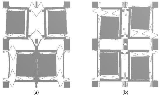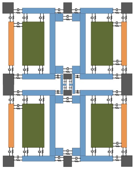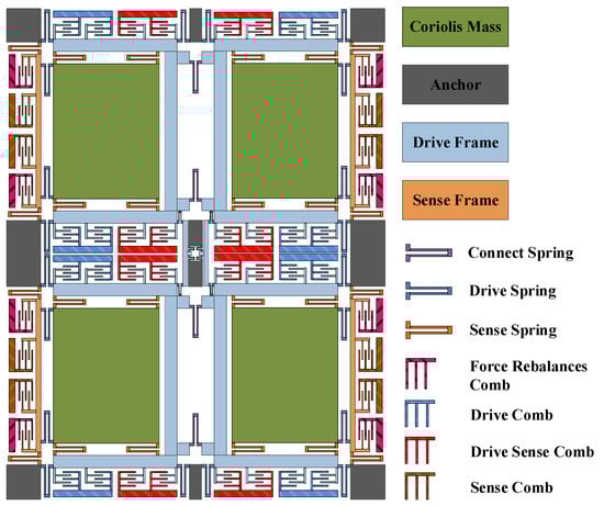 Figure 1 shows the structure of FVMMG with four sensitive blocks at its core. The four-mass harmonic oscillator consists of 10 supporting anchors, 16 driving and detection frames, 4 mass blocks and multiple folded beams for connection, drive, and detection (the specific structure is shown in Figure 1). Four cross-shaped driving and detection frames are designed around each mass block. One end of the drive frame and the detection frame is connected with the mass block through the folding beam, and the other end is connected with the supporting anchorage point. The reasonable selection of the stiffness of the folded beam and the design of the 2-DOF structure effectively decouple the driving mode from the detection mode.