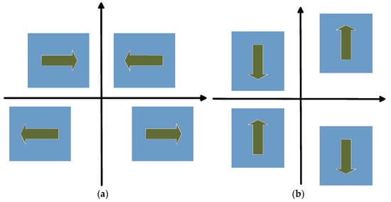 FMVMG is a kind of Coriolis vibration gyroscope. Its working mechanism is the mutual transfer of Coriolis force coupling energy between driving mode and detection mode. wave. Its working mode is shown in Figure 3. When there is no external input angular velocity, a periodic sinusoidal AC signal is applied to the driving electrode of each mass block to obtain the driving mode shown in Figure 3a. When the mounted carrier rotates in the direction perpendicular to the driving vibration, an angular velocity is generated on the z-axis, and the energy of the driving mode forms the vibration of the detection mode as shown in Figure 3b through the Coriolis effect.