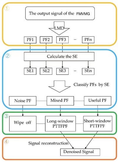 In recent years, time-frequency peak filtering (TFPF) has been applied more and more in the field of signal processing []. However, the traditional TFPF has disadvantages in the selection of window length. Using a fixed window length for all signal components will result in a serious loss of effective components or insufficient noise reduction capabilities. In addition, the PTTFPF resamples the signal along the parabolic trajectory, this method can enhance linearity and effectively improve the performance of traditional TFPF [,,]. However, the curvature in the data of the FMVMG is relatively complicated, and it is difficult to accurately fit a parabola to a signal mixed with noise. In order to solve these problems, we combine PTTFPF and ILMD in this article. The interval local mean decomposition (ILMD) method is essentially a combination of local mean decomposition (LMD) [,,,] and sample entropy (SE) [,]. First, the traditional LMD algorithm is used to decompose the FMVMG signal into several product functions (PFs); second, based on the characteristics of sample entropy calculation and product functions, the numerous PFs are divided into three categories: noise PF, mixed PF, and useful PF. The noise PFs should be wiped off directly. The mixed PF is denoised with a long-window PTTFPF, because long-window PTTFPF can effectively reduce random noise. The useful PF is denoised with a short-window PTTFPF, this can make the linearity in the window best, so as to retain the information of the signal effectively on the basis of removing the noise. Finally, recombine the denoised mixed PF and denoised useful PF to get the final denoised signal.