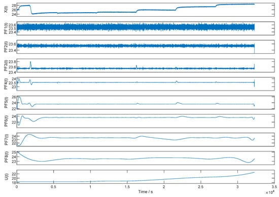 According to the ILMD-PTTFPF algorithm, the first step is the local mean decomposition of the original signal. The output signal of FMVMG is decomposed into eight PFs with different physical properties and one residual component. The product function is obtained by multiplying the envelope signal with the frequency-modulated signal. The complete time-frequency distribution of the original signal can be obtained by combining the parameters of each PF. Figure 8 is the result of LMD, where X(t) is the original output signal of FMVMG and U(t) is the residual component.