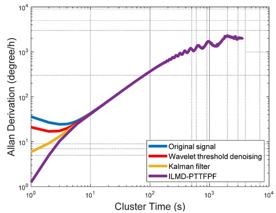 Indicators of signals after denoising by each method are shown in Table 2 [,]. Allan variance is a standard gyroscope performance analysis method recognized by IEEE and it is widely used []. Comparison of Allan variance of three noise reduction methods is shown in Figure 12. The bias stability can reflect the random drift characteristic of the gyroscope. The bias stability is an important indicator to reflect the performance of the gyroscope among the performance indicators of the gyroscope, the smaller the bias stability of the gyroscope, the stronger the performance of the gyroscope. The signal to noise ratio (SNR) is the ratio of the effective power of the useful signal to the noise signal, the higher the SNR value, the lower the noise of the signal. Standard deviation can reflect the degree of dispersion of a data set, and it can also indicate the strength of signal noise.