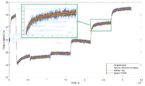 It can be seen from Table 2 that compared with the original signal, the bias stability of signal denoised by ILMD-PTTFPF method is improved by about 19 times, it is optimized by 94.8%. The SNR is improved by about 24 dB (noise characteristics are reduced by 24 dB). The comparison results in Figure 13 show that the ILMD-PTTFPF method has better noise reduction performance than traditional wavelet threshold denoising and Kalman filtering.