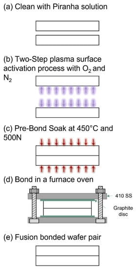 Figure 1 describes the full process of fusion bonding the borosilicate glass wafers. The borosilicate glass wafers used in this experiment were Borofloat 33 glass wafers with a diameter of (100 ± 0.1) mm and thickness of 700 µm (University Wafer, South Boston, MA, USA). The topside and backside surface roughness of the wafers are both <1 nm, with a warp of <30 µm. The bonding process was conducted in an ISO 5, Class 100 cleanroom environment. All wafers were cleaned in a piranha solution (H2SO4:H2O2 = 4:1) that was prepared at ambient temperature and were cleaned for 10 min (Figure 1a). All samples were immediately cleaned after the preparation of the piranha solution. The wafers were then rinsed with deionized (DI) water and dried in pure N2 in a Semitool Spin Rinser (Semitool PSC-101, Semitool, Kalispell, MT, USA). The wafers were prepared to be used immediately, to ensure that all organic surface contaminants were removed.