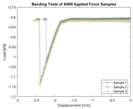 Displacement versus load plots measured during bending tests, conducted on n = 3 samples; the flexural strength of the sample was calculated based on the average of the break forces.