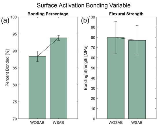 Surface-activation bonding variable with SAB (WSAB) and without SAB (WOSAB) show (a) the average bonding percentage and (b) flexural strength with sample standard error bars.