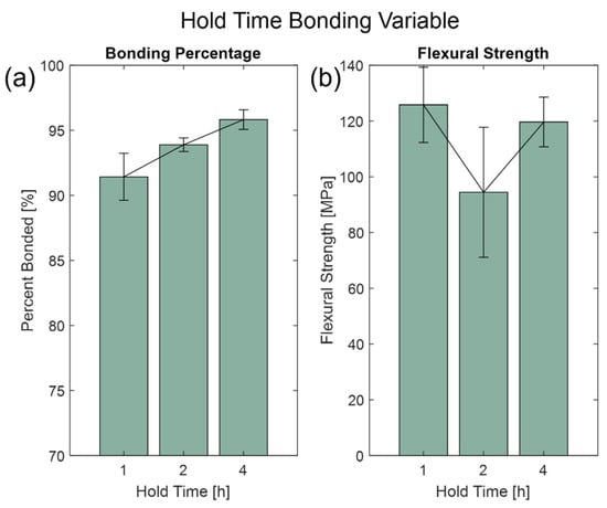 Hold time bonding variable at 1 h, 2 h, and 4 h. Bar graphs show (a) the average bonding percentages and (b) flexural strength with sample standard error bars.
