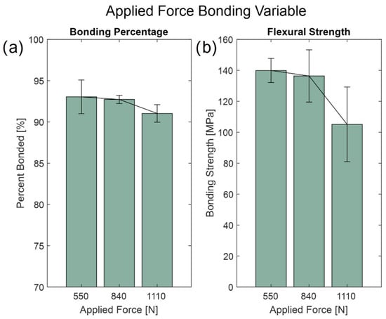 Applied force bonding variables at 550 N, 840 N, and 1110 N show (a) the average bonding percentage and (b) flexural strength with sample standard error bars.