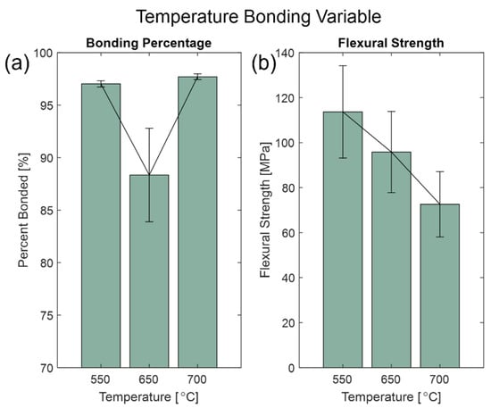 High-temperature bonding variable at 550 °C, 650 °C, and 700 °C. Bar graphs show (a) the average bonding percentage and (b) flexural strength with sample standard error bars.