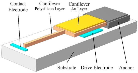 The driving voltage U is gradually increased and the current between the cantilever beam and the contact electrode is monitored. When the current indicates conduction, the driving voltage is recorded as UCA. Young’s modulus E can be obtained by substituting Equation (8) and Equation (11) into Equation (7):