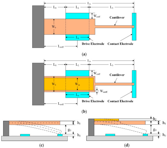Test structure A is shown in Figure 2a,c, and one end of the polysilicon cantilever beam of test structure A is fixed on the substrate via the anchor; a bottom drive electrode is fabricated on the substrate near the anchor; and a bottom contact electrode is fabricated on the substrate below the free end of the cantilever beam. The drive electrode is used to apply a driving voltage to produce electrostatic force, while the contact electrode is used to detect the contact at the free end of the cantilever beam. The length of the cantilever beam is Lb, the width is Wb, and the thickness is h1. The length of the drive electrode is Le; the width of the drive electrode is widened by Weoff at each edge than the width of the cantilever beam; the distance between the middle point of the drive electrode and the anchor is Leoff; and the thickness of the drive electrode is h0. The initial gap between the cantilever beam and the drive electrode is g0. In order to avoid the pull-in phenomenon, Leoff should be less than one third of Lb. As shown in Figure 2b,d, the cantilever structure of test structure B is an Au/polysilicon bilayer film. The thickness of the Au layer is h2. Due to process constraints, both the length and width of the Au layer are smaller than those of the polysilicon layer. The distance between the edge of the Au layer and the polysilicon layer is Wmoff; accordingly, the width of the Au layer is Wm. A different design dimension of test structure B with test structure A will not affect the data processing and calculations of Young’s moduli.