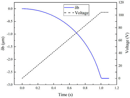 In order to avoid the pull-in phenomenon by using the steady-state simulation, the transient simulation method is adopted. In order to avoid the effects of kinetic energy when the step voltage is applied, the driving voltage is linearly applied in the transient simulation, as demonstrated in the experiment. Considering that the response relaxation time of the designed test structure listed in Table 2 is less than 0.1 s, and no air damping is applied in the simulation, the total rise time of the driving voltage is set to be 1 s. After the rise, a 0.1 s voltage hold time is set for structure stabilization. The results at 1.1 s are recorded.