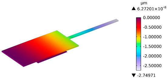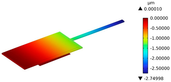 Eight types of test structure A with different dimensions listed in Table 2 are simulated. The simulation result of vertical displacement of test structure 1-A at 1.1 s is demonstrated in Figure 5. The contact voltage UCA and the maximum free-end displacement δbA obtained by simulation are presented in Table 3. Considering that the influence of Poisson’s ratio on the test structure in simulation may be different from the classical theory of mechanics of materials, a simulated effective Young modulus with the zero Poisson ratio is introduced for verification purposes and the input effective Young modulus is calculated from the classical theory by using input simulation parameters. In the simulation, the input Young modulus E1-In and the Poisson ratio ṽ1 of polysilicon are set to be 160 GPa and 0.22, respectively, and the vacuum dielectric constant ε0 is set as 8.85 × 10−12 F/m; accordingly, the input effective Young modulus of polysilicon (Ẽ1-EQ) calculated from Equation (13) is equal to 168.138 GPa. The values of the effective Young modulus of polysilicon (Ẽ1) estimated from the proposed theory model by substituting simulation results of UCA into Equation (14) are shown in Table 3. The error between Ẽ1 and Ẽ1-EQ is less than ±7%. The simulation is rerun with Poisson’s ratio set as zero. The simulated effective Young modulus Ẽ1-FEA is then obtained as 164.430 Gpa. The error between Ẽ1 and Ẽ1-FEA is less than ±5%.