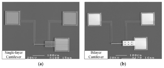 The samples of test structure A and test structure B of different sizes listed in Table 2 are fabricated by using the standard surface-micromachining process from PolyMUMPs (MEMSCAP Inc., Durham, NC, USA). The structural layers in the process include poly0, poly1, poly2, and metal layers, and the sacrificial layers include the first oxide between poly0 and poly1 and the second oxide between poly1 and poly2. The poly0, poly1, and poly2 layers are made of polysilicon fabricated by using low-pressure chemical vapor deposition (LPCVD); the first oxide and second oxide layers are made of phosphosilicate glass (PSG) fabricated by using LPCVD; and the metal layer is made of Au fabricated by sputtering. The drive electrode and contact electrode are fabricated by poly0; the single-layer cantilever beam of test structure A is fabricated by poly2; the bilayer cantilever beam of test structure B is fabricated by poly2 and metal; and the sacrificial layer is fabricated by combined first oxide and second oxide layers. The SEM image of the test structures are shown in Figure 7.