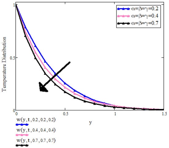 Figure 2 shows the effect of fractional parameters on the temperature profile. It can be seen that by increasing the values of fractional parameters , , , the temperature is decreasing. Physically, the fractional solution behaves as dual for small and large times for different values of fractional parameters. It is evident that for large values of time, the fluid temperature decreases. Therefore, we have a choice to achieve the desired results of the fractional model.