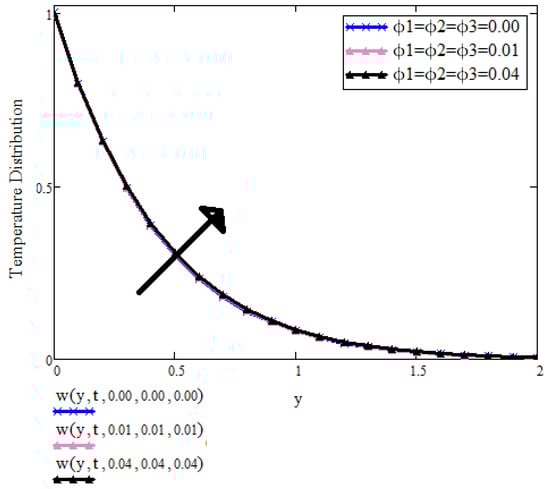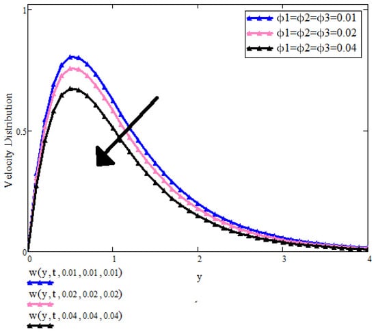 Figure 6 is intended to show the effect of the concentration of nanoparticles on the velocity field. It can be seen that by increasing the concentration of nanoparticles velocity profile is decreasing. Figure 6 depicted the impact of the concentration of ternary nanoparticles on velocity. It is found that larger the values of and stronger the viscous force makes the boundary layer denser and hence decreases.
