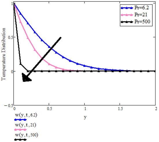 Figure 4 is showing the behavior of Pr with respect to the temperature field. When Pr values increase, temperature distribution declines. Pr number is a ratio between momentum diffusivity to heat diffusivity. Fluids with inferior Pr number values have greater thermal conductivity, which causes heat diffuse far from the heated surface more swiftly and quicker in comparison to increased values of Pr. Consequently, Figure 4 represents the ternary nanoparticles by choosing different base fluids, for example water, kerosene, and engine oil, respectively. It is very clear that by taking engine oil as the base fluid, the temperature decreases due to high values of Prandtl number.
