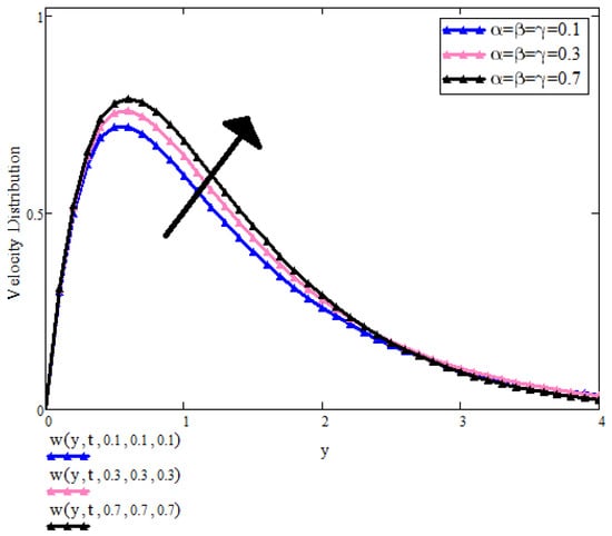 Figure 5 shows the impact of fractional parameters on the velocity profile. It can be seen that by increasing the values of fractional parameters, the velocity profile increases. With time, the boundary layer thickness increases and the velocity is extreme in that area of the plate. Physically, the fractional solution behaves dual for small and large times for different values of fractional parameters. It is evident that for large values of time, the fluid velocity increases. Therefore, we have a choice to achieve the desired results of the fractional model.