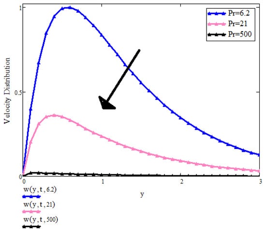 Figure 7 shows the effect of Pr on the velocity field. By raising Pr values, the velocity distribution is decreasing. Due to the difference between the thermal conductivities of different base fluids, the thermal conductivity of water is comparatively higher than kerosene and engine oil. Velocity became higher, and a more distinctive peak is observed near the plate. Therefore, an upsurge in the thickness of the boundary layer condenses velocity distribution.