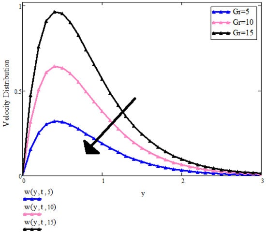 Figure 8 is indicating the effect of Grashof number Gr on the velocity profile. The velocity of the fluid is increasing by increasing Gr values. Gr number is a ratio between buoyancy forces and viscous forces. For increased Gr values, buoyancy forces increase, which upsurges the induced flow as an outcome, and the velocity of the fluid can be enhanced.