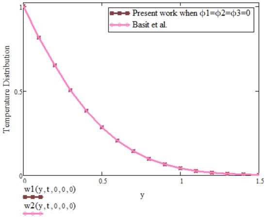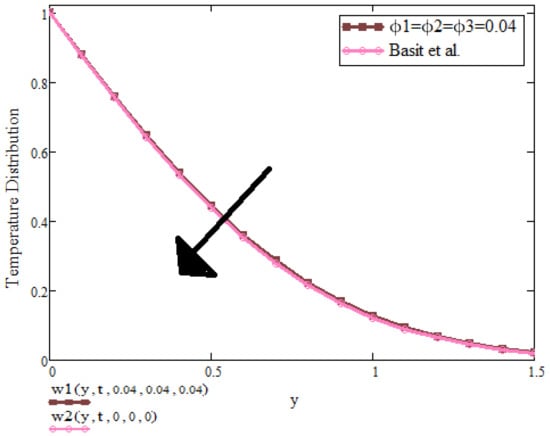 Figure 9 is about the comparison of temperature between present result and already published work by Basit et al. []. From the figure, it is clear that in the absence of concentration of nanoparticles = 0, the result from recent literature are retrieved. This fact provides the validation of the present work.