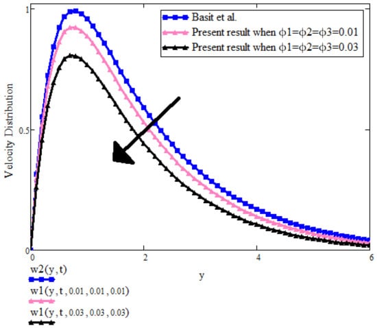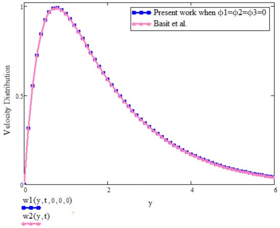 Figure 11 is about the comparison of velocity between the present result and already published work by Basit et al. []. From the figure, it is clear that in the absence of concentration of nanoparticles = 0, the results from recent literature are retrieved. This fact provides the validation of the present work.
