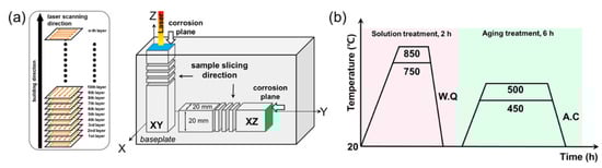 (a) Schematic diagram of sample geometries, scanning strategy, building direction, corrosion test planes, and (b) various heat treatment processes.