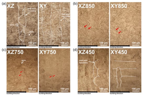 OM images of laser-powder-bed-fused MS: (a) as-built, (b) 850 °C heat treated, (c) 750 °C heat treated, and (d) 450 °C heat treated.