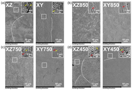 SEM images of XZ-plane of laser-powder-bed-fused MS: (a) as-built, (b) 850 °C heat-treated, (c) 750 °C heat-treated, and (d) 450 °C heat-treated.