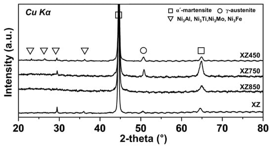 Figure 4 shows the XRD analysis results of the as-built and post-heat-treated XZ specimens. The main diffraction peak is the α′-martensite phase in all specimens, which is formed by a rapid cooling rate of more than 106 K/s during the LPBF manufacturing process and is almost fully martensitic phase in the as-built state. The lath-type precipitate observed corresponds to Ni-based intermetallic compounds, such as Ni3Al, Ni3Ti, Ni3Mo, and Ni3Fe, found in the range of 20°–40°. It is somewhat clearly observed in the XZ and XZ450 specimens and seen at approximately 28° in XZ750 specimen. No peaks of the Ti-rich phase were observed owing to its small fraction. Meanwhile, the retained γ-austenite phase was observed only in the XZ, XZ750, and XZ450 specimens but not in the XZ850 specimen. It is concluded that the retained γ-austenite phase completely disappeared during the solution heat treatment at 850 °C.