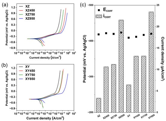 Corrosion resistance of each specimen in 3.5 wt.% NaCl solution: (a) potentiodynamic polarization curves of XZ-plane, (b) potentiodynamic polarization curves of XY-plane, and (c) comparison of corrosion potential (Ecorr) and corrosion current density (icorr).