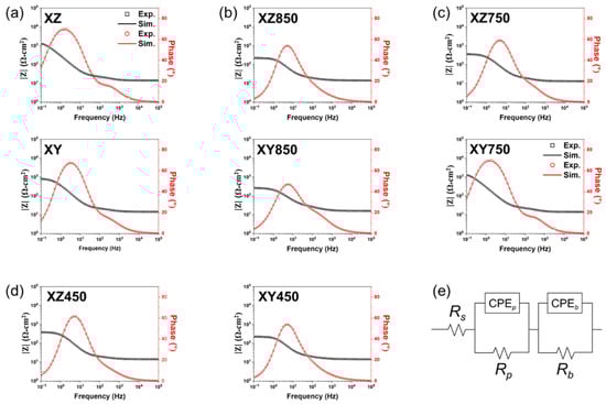 Bode spectra for each specimen in 3.5 wt.% NaCl solution: (a) as-built, (b) 850 °C heat treated, (c) 750 °C heat treated, and (d) 450 °C heat treated. (e) Equivalent circuit for data fitting.