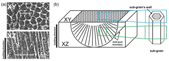 (a) Microstructures of the XZ and XY and (b) schematic illustrations of the sub-grain structure in a single melt track.