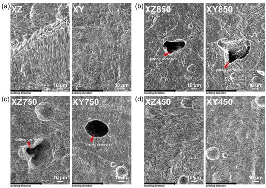 Figure 5a,b show the potentiodynamic polarization curves of the sample in 3.5 wt.% NaCl solution. The corrosion current density and potential estimated by Tafel fitting are summarized in Figure 5c. For the as-built MS in the XZ-plane, the corrosion current density was 3.34 μA/cm2. The aging at 450 °C (XZ450) and heat treatment at 750 °C (XZ750) caused a partial dissolution of sub-grain cells in the as-built MS, which increased the corrosion current density to 10.63 and 11.21 μA/cm2, respectively. The wall of the sub-grain cell is formed by locally segregated Ni and Mo [39,40,41,42,43], which improve the corrosion resistance of steel by forming a passive layer; thus, the partial elimination of sub-grain cells decreases the corrosion resistance. Because of the complete elimination of sub-grain cells by heat treatment at 850 °C (XZ850), the corrosion current density increases significantly to 21.55 μA/cm2, which is 18.21 μA/cm2 higher than that of XZ. The change in the corrosion resistance of the as-built XY-plane upon heat treatment is similar to that in the XZ-plane. The corrosion current density of the XY-plane of the as-built MS is 6.43 μA/cm2. The corrosion current densities increased to 13.13 and 13.15 μA/cm2 after heat treatment at 750 °C (XY750) and aging at 450 °C (XY450), respectively, which partially eliminates the sub-grain cells of the as-built MS. In addition, the heat treatment at 850 °C completely eliminated the sub-grain cells, which significantly increased the corrosion current density to 23.45 μA/cm2 (17.02 μA/cm2 fold higher than XY). The corrosion current densities of XZ450 and XY450 are slightly lower than those of XZ750 and XY750, respectively. This indicates that the heat treatment at 750 °C is more effective for dissolving partial segregation of alloying elements than aging at 450 °C.