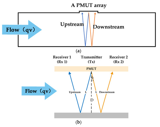 A single PMUT array is symmetrically divided into one transmitter and two receivers. Since the smooth plane of the wall, the received echo signal is formed by reflections from different points [17], as shown in Figure 1. In Figure 1a a single PMUT array is mounted on the pipe, and the center of the array emits ultrasound and the elements on either side of the array receive it. The schematic diagram of ultrasonic wave transmitting and receiving is shown in Figure 1b. Theoretically, the ultrasonic sound path is the same in the zero-flow situation, so there is no dTof between the two receivers. As the flow rate changes, the ultrasound beam is deflected, thus generating a dTof between the receivers. The relationship between dTof(∆t) and flow rate can be calculated from Equations (1)–(5).