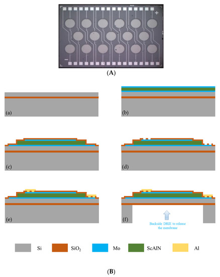 The process flow of the PMUT array is shown in Figure 2B. (a) A single-sided polished SOI wafer was customized. (b) A multilayer bottom Mo electrode, ScAlN layer, and top Mo electrode were sputtered on the SOI wafer. (c) The bottom Mo electrode, ScAlN layer, and top Mo electrode were patterned by plasma etching, and oxide layers were deposited to form isolation layers. (d) Through holes for the top and bottom electrodes were designed. (e) Aluminum (Al) wires and bond pads were subsequently deposited and patterned. (f) Deep reactive ion etching (DRIE) was performed from the backside of the SOI wafer to release the patterned film. The whole process was performed at the Shanghai Industrial μTechnology Research Institute (SITRI).