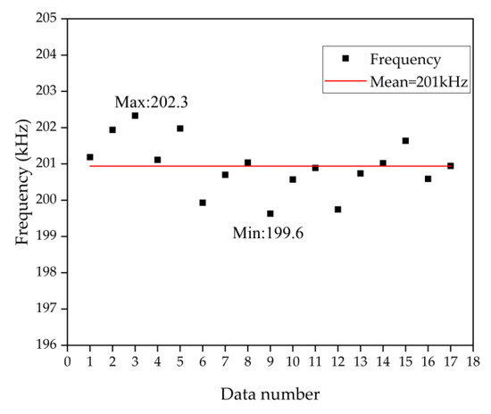 The frequency distribution of the PMUT array, the mean frequency is 201 kHz with a deviation of 1.5 kHz (the standard deviation is 0.732).