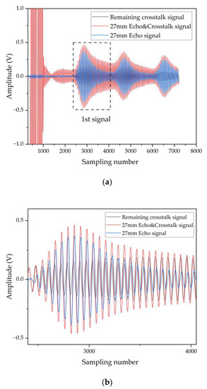 (a) Pulse echo measurement at 27 mm in distance and remaining crosstalk signal. (b) The detail of 1st signal.