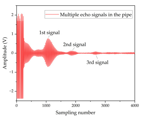 The ultrasonic path L is the parameter that is not measured and is involved in the flowmeter. As shown in Figure 9, the centers from the transmitter to the receiver are at a distance d0 of 1500 µm. The distance D from the device to the tube wall is designed to be 27 mm, so D >> d0/2. From Equation (15), it can be considered that D~L. However, the D values will be deviated from the design value due to errors in transducer installation. The tof between the excitation signal and the echo signal cannot be measured accurately due to the delay in the system. In contrast, the high similarity between multiple echoes allows a more accurate tof obtained from the cross-correlation method. Multiple echo signals in the pipe are shown in Figure 10. The temperature in the pipe is 23 °C. The tof calculated using the primary and secondary echo signals is 152.622 us. The D derived from Equation (16) is 26.4 mm, which is also the ultrasonic path L.