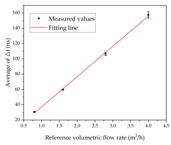 Before the start of the experiment, it is necessary to determine the standard flow rates. The detection flow rates are 0.8 m3/h, 1.6 m3/h, 2.8 m3/h, 4 m3/h, and each measurement lasted 60 s. Figure 11 shows the dTof corresponding to different volumetric flow rates. As predicted by Equation (6), the average of dTof varies linearly with the volumetric flow rates. However, as the flow rate increases from 0.8 to 4 m3/h, the variance of dTof varies from 0.433 to 4.247.