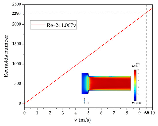 Reynolds number versus flow velocity (CFD simulation is inserted in the figure to represent the flow velocity distribution in the pipe when the flow rate is 4 m3/h).