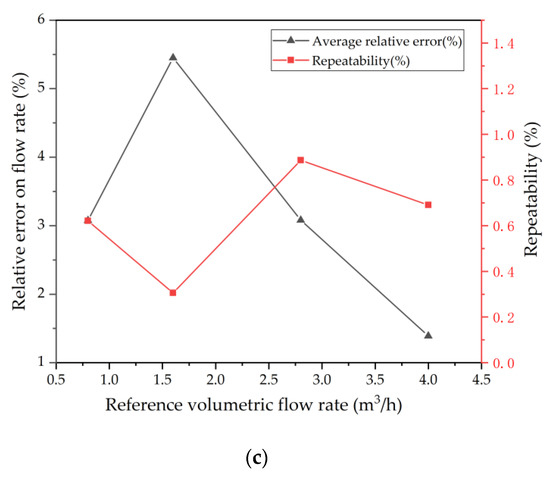 To determine the relative and repeatability [26] errors of the flow. Six measurements are conducted at one single flow rate and each measurement lasts 60 s. Figure 14a shows the ultrasonic volumetric flow rate after calibration using kc = 0.93. It can be seen that the error decreases at higher flow rates in Figure 14b. However, since the kc is selected with a mean value, a large error can occur at some flow points (such as 1.6 m3/h). The average values of the relative error of the six measurements are shown in Figure 14c and are within 5% relative error, and the repeatability error is less than 0.88%.