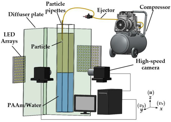 Figure 1 shows the experimental setup used to trace the particle motion in stratified fluids. In this study, experiments were conducted in an acrylic tank (150 mm × 150 mm × 1000 mm) filled with a stratified fluid. By using an ejector to generate vacuum pressure on the particle, the particle could be released without perturbation. Two high-speed cameras (FASTCAM Mini UX, Photron, Yonezawa, Japan) were used to facilitate high-speed shadowgraph binocular-imaging and to record the particle trajectory in x–z and y–z planes. The light source was provided by two LED arrays, and the binocular-imaging system was used to track the particle motion.