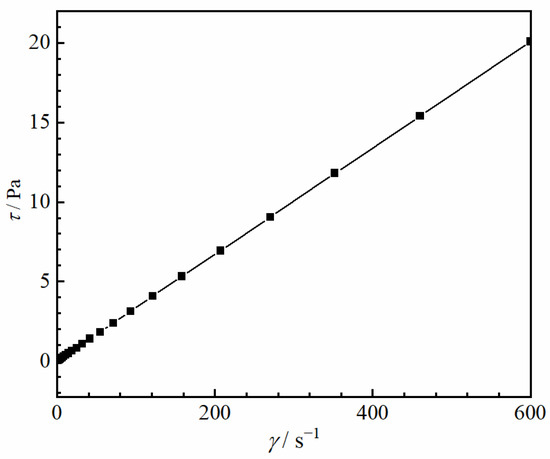 The stratified fluids used in the experiments were as follows: (I) a stratified fluid with a Newtonian–Newtonian fluid interface comprising mineral oil (Sigma-Aldrich M5904, Shanghai, China) as the upper fluid and water as the lower fluid; (II) a stratified fluid with a Newtonian–non-Newtonian fluid interface comprising oil as the upper fluid and 0.5 wt% polyacrylamide (PAAm, Shanghai Macklin Biochemical Co., Shanghai, China) as the lower fluid. The densities of the water, oil, and PAAm were 1000, 840, and 1005 kg/m3, respectively. Accordingly, oil could be used as the upper fluid. Figure 2 shows the rheological characteristics of the mineral oil, and the rheological properties of water and PAAm refer to our previous research [27]. The data were measured at 20 °C using a rheometer (MCR 302 Multidrive, Anton Paar Co., Graz, Autria). Based on the measurement results, the shear stress τ was linearly correlated with the shear rate γ of the water and mineral oil, whereas the same relationship in the case of the PAAm solution was nonlinear. Since the viscosity μ is the ratio of τ to γ, and the rheological curve slope for the PAAm solution gradually decreases, the viscosity of the PAAm solution decreases with the increase in γ. Thus, the PAAm solution is a shear-thinning fluid. The storage modulus and loss modulus data of PAAm solution in our previous study demonstrates that the PAAm solution is a viscoelastic fluid [27]. Two types of particles were selected for the experiments (Table 1), and the radius of both these particles R was set to 2.5 mm, to eliminate the influence of the geometry; only the densities and type of material differed. The materials of the particles used in the experiment were polytetrafluoroethylene (PTFE) and silicon nitride ceramics (Si3N4). The diameter variation of the particles was less than 0.25 μm. The dimensionless distance D* was adopted to describe the particle size and the distance D between the particle and the wall (Figure 3):