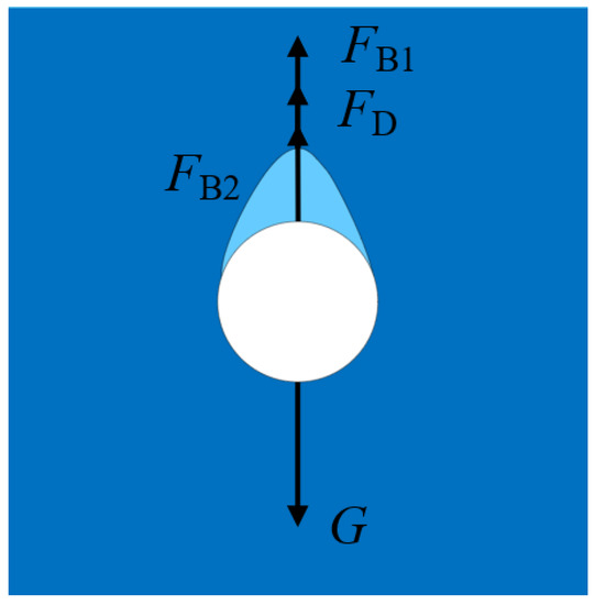 After a particle detaches from a liquid–liquid interface, a droplet of the upper fluid will attach to the tail of the particle. Thus, the forces acting on the particle include the gravity G, particle buoyancy FB1, attached droplet buoyancy FB2, and total drag force FD (Figure 4):