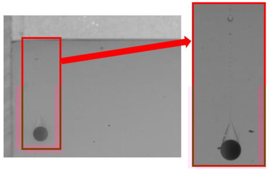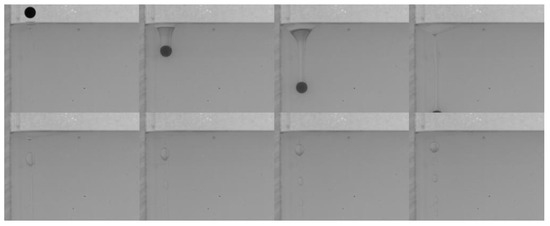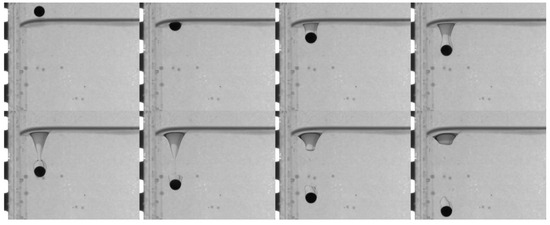 When the lower fluid is 0.5 wt% polyacrylamide solution, the tail pinch-off model is similar for both PTFE and Si3N4 particles. The shallow and deep seal pinch-off phenomena occur almost simultaneously, and then series satellite droplets are formed (Figure 7 and Figure 8). Unlike the deep seal pinch-off characteristics in the oil–water stratified fluid in which the pinch-off location is near the particle, the locations of both deep and shallow seal pinch-off in the oil–PAAm stratified fluid are close the interface. This can be attributed to the shear-thinning behavior of the PAAm solution. Once the particle enters the PAAm solution, its settling velocity decreases rapidly, but then plateaus. The decreasing shear velocity indicates that the viscosity of the PAAm solution near the interface is the lowest, favoring the pinch-off. Thus, both shallow and deep seal pinch-off phenomena occur near the interface. After the pinch-off, the upper half of the tail recedes toward the interface, during which the smaller satellite droplets detach from the tail. This phenomenon also occurs in the lower half of the tail and is more evident therein. In Figure 9, a series of satellite droplets detach along a straight line due to the propagation wave, which is similar to the shedding of satellite bubbles behind the air cavity behind the impact of the particle [31,32].