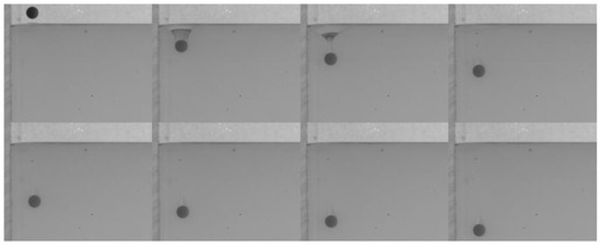 Pinch-off process of PTFE particles in an oil–water stratified fluid. The dimensionless distance D* = 1, and the time interval Δt between adjacent images is 25 ms.