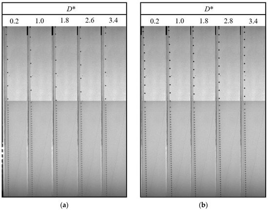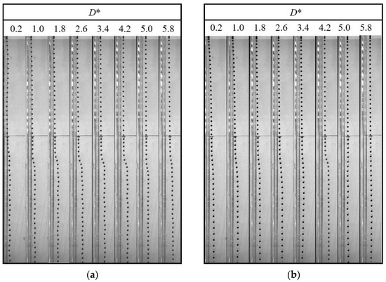 Particle trajectory in an oil–water stratified fluid at different dimensionless distances D*: (a) PTFE particle with Δt = 50 ms; (b) Si3N4 particle with Δt = 30 ms.