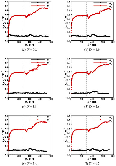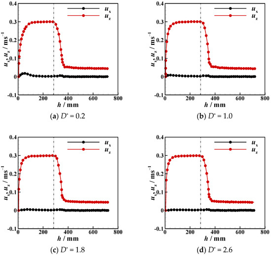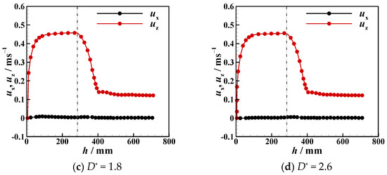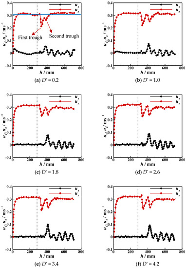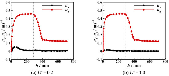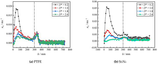 Due to the presence of an interface, the settling velocity is related to the process whereby the particle detaches from the liquid–liquid interfaces, the tail pinch-off mechanism, and the transverse migration. In this section, the settling velocity (uz) of different particles in different stratified fluids is discussed. In Figure 12, Figure 13, Figure 14, Figure 15, Figure 16 and Figure 17, the left side of the dotted line represents the particle velocity in the upper fluid, and the right side of the dotted line represents the particle velocity in the lower fluid. After the particle is released, uz rises quickly, and the particle reaches the force balance state and starts to move uniformly in the upper fluid, which is common for both PTFE and Si3N4 particles in oil–water and oil–PAAm stratified fluids. When the lighter PTFE particle arrives at the oil–water interface, its kinetic energy is transferred to the surrounding fluid, and uz rapidly decreases to the first trough before pinch-off occurs (Figure 12). Due to the particles used in the experiment, even the lighter PTFE particles cannot stay in the liquid–liquid interface, the particles enter the lower fluid before film drainage is completed. At this time, the front part of the particle is still wrapped in mineral oil while the pinch-off of the tail behind the particle has not taken place. Thus, the whole particle is wrapped in mineral oil. Therefore, the particles are in the slip boundary condition, and the friction drag of the particles will be reduced [41]. Thus, this velocity decreasing process is the result of the competition between the particle inertia, gravity, buoyancy, friction drag, form drag, and interface tension [10]. Subsequently, the pinch-off occurs, and the pull force applied by the interface on the particle vanishes, and uz starts to increase. As mentioned above, the particle trajectory in the oil–water stratified fluid has a sudden transverse migration in the lower fluid, which is also reflected in both vertical and transverse velocity (ux) variations. The appearance of transverse migration means an increase in ux. When transverse migration occurs, uz drops to the second trough, while ux reaches its maximum value. Considering the energy conservation principle, a rising ux implies a decreasing uz. With increasing D*, the value of the second trough further declines, which corresponds to the gradually evident transverse migration mentioned in Section 3.2. After the sudden transverse migration distancing the particle and the wall, the wake vortex and the forces become balanced, and uz of the particle plateaus again. Regardless of D*, the value of uz in oil with higher viscosity or in water with lower viscosity is approximately 0.3 m/s. This is because the attached oil droplet provides buoyancy for the particle, and thus, uz of the particle in water is close to that of the particle in oil. For ux, it fluctuates with a small amplitude because of periodic and alternate shedding vortices [37,38]. As for the Si3N4 particle, the mechanism of the first trough is similar to that exhibited by the PTFE particle due to the particle detaching motion. Conversely, the transverse migration of the Si3N4 particle trajectory does not occur as abruptly as that of the PTFE particle. Therefore, the effect of transverse migration on uz mainly causes the slowing down of the rising rate of uz. In Figure 13, particularly Figure 13d,e, there is a transient plateau of uz. Furthermore, the trend of ux of the Si3N4 particle has a smaller change rate than that of the PTFE particle, confirming the weaker influence of the wake on the particle with greater inertia. Furthermore, the terminal vertical velocity in water is greater than the velocity in oil, indicating that the buoyance provided by the attached droplet is limited for the Si3N4 particle compared with the PTFE particle. Owing to the high viscosity of the PAAm solution, uz rapidly reaches plateau after the plummeting of uz, and the terminal velocity is significantly lower than that in oil (Figure 14 and Figure 15). The wall still has an effect on ux, even though the overall from the inclined straight trajectory in the oil–PAAm stratified fluid, ux is very small compared with ux in oil–water stratified fluid. Owing to the low Re* (1.3 for the PTFE particle and 5.7 for the Si3N4 particle), the particle wake is very stable, and both uz and ux are nearly constant. In Figure 16, especially when the particle is near the wall, the pressure gradient between the particle and wall is large. So the wall changes the lift force of the particle, and the particle will migrate laterally [19]. Figure 16b, the smaller D* is, the greater the variation of ux of particles; that is, the closer the particles are to the wall, the greater the force exerted by the wall on transverse migration of particles. Figure 17 shows that the velocity evolution in the absence of a wall is largely the same as the trend in the near-wall settling velocities. Furthermore, the free settling velocity is also close to the near-wall settling velocities. Both the trends and values of the velocity further demonstrate that the wall mainly influences the settling trajectory and transverse migration.